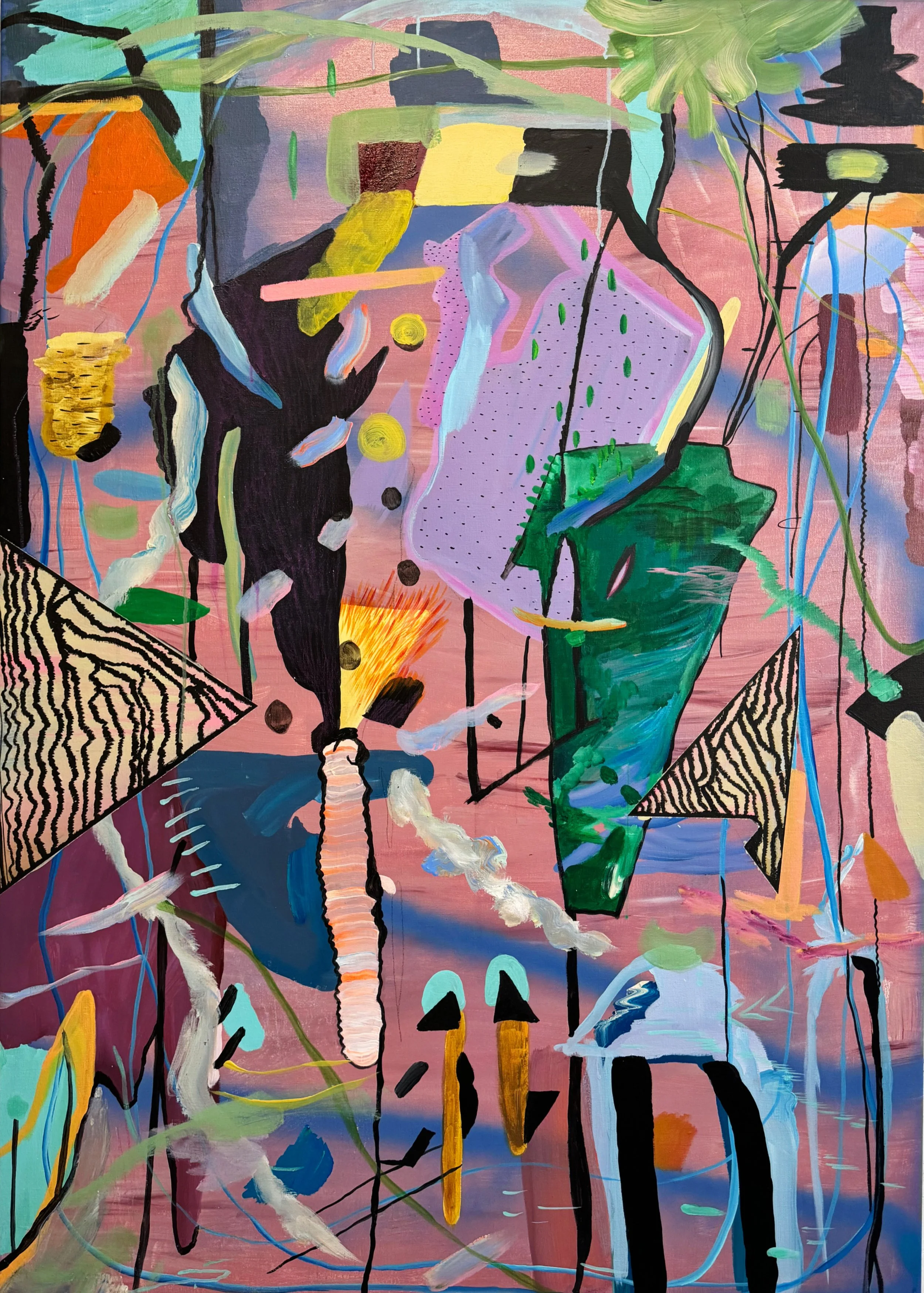 Since 20 years I create, I always liked to use lines and colors with their own energy ; some lines are there to shred, scratch, they respond to the unconscious and to a physical force. They allow the eyes to dance. Others are there to define, circumvent, crop... These are used in a need for control or for narrative. I like to navigate between those opposite energies and confront them through the line and the colors.. .This creates a tension between sweetness and violence, darkness and joy, dream and reality, harmony and disharmony. For me, the whole pleasure of painting is to be able to use the accumulation of layers and "pentimento". What do I reveal? What do I hide? What do I take out? There is something very mysterious and poetic in this practice, which leaves a lot of room for the invisible. To feed this vocabulary of lines and forms, I take a lot of pictures as a source of inspiration in the everyday life, nature and from my dreams. Patterns, details, fractals, a plant, a wallpaper, a texture, bio cells, abyssal forms, no matter when it evokes an emotion and aesthetic interest to me. Also, I listen to a lot of different music which gives me ideas of very varied lines and I dance a lot during the process. It helps me to give to the canvas different kinds of intentions and energy in my gesture. Sometimes strong, sometimes soft. Electronic, Jazz, Classical and soundtrack music are the music styles I listen the most in my studio but I love to discover some odd and psychedelic music from all over the world and from different decades to enrich this vocabulary. This gives me the feeling of being creating a cinema, a canvas, always in motion. In this respect I feel close to Vassily Kandinsky and his synaesthesia where when he hears a sound, he sees a color or a movement. Everything is dance, vibration and emotion.